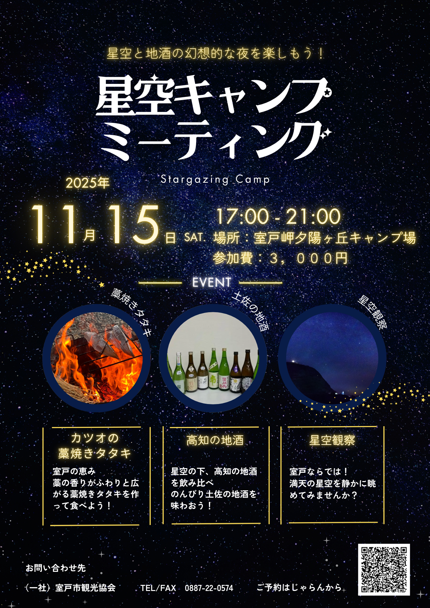 星空キャンプミーティング開催! 公開済み: 2025年11月6日更新: 2025年11月6日作成者: 室戸市観光協会カテゴリー: お知らせ 日時:2025年11月15日(土) 17:00~21:00 場所:室戸夕陽ヶ丘キャンプ場 参加費:3000円 ~星空と地酒の幻想的な夜を楽しもう!~ 土佐の地酒を味わいながら、藁焼きタタキでお腹が満たされ 大自然の中、草木のさざめきをBGMに、満天の星空で心が満たされる そんな週末を過ごしに来てみませんか? お申込みは じゃらんにて受け付けています 関連記事 16 室戸岬夕陽ヶ丘キャンプ場 臨時休業延期のお知らせ 2020年12月26日(土)~2021年1月11日(月)まで、新型コロナウィルスの感染拡大に伴う対策として夕陽ヶ丘キャンプ場を休業させて頂きましたが、GoToトラベルの全国一斉利用停止に準じて下記の通り、休業期間を延長す […] 公開済み: 2021年1月16日更新: 2021年1月16日作成者: 室戸市観光協会カテゴリー: お知らせ 13 鯨舟競漕大会について 開催日が変更になりました 令和6年8月24日(土)9:00~ 予定を組んでいただいてたかと思います、大変申し訳ございません。 同日開催予定の「こぢゃんち楽笑祭~夏の陣~」も24日(土)に開催いたします。 引き続き、鯨舟レ […] 公開済み: 2024年6月13日更新: 2024年6月13日作成者: 室戸市観光協会カテゴリー: お知らせ 15 室戸春ぶり『春が旬』室戸の春をお届けします!! 室戸の春、満開の桜と大漁の鰤。 高知県の東、黒潮が流れる室戸沖はぶり、サバ、アジなど、多くの魚が回遊する日本でも屈指の好漁場。 地元の漁師は100年以上前から船で10分ほどの海に「大敷網」という網をしかけて漁を続けてきま […] 公開済み: 2025年3月15日更新: 2025年3月15日作成者: 室戸市観光協会カテゴリー: お知らせ