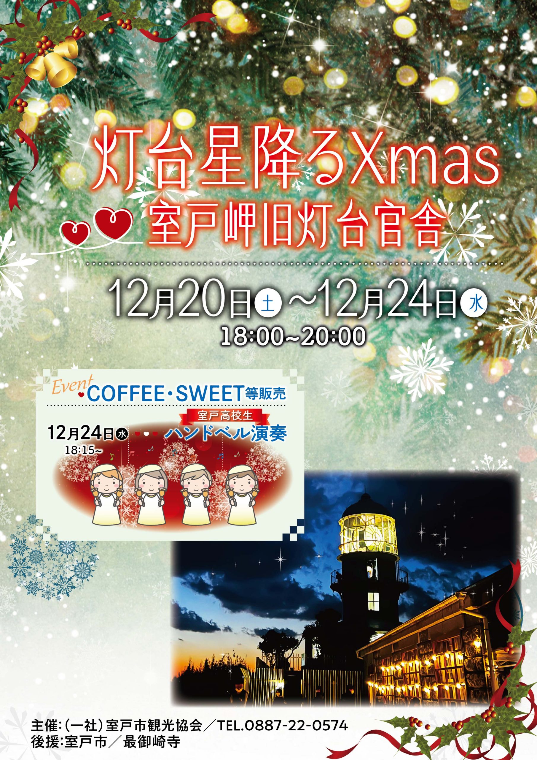 ~灯台星降るXmas~ 公開済み: 2025年12月3日更新: 2025年12月3日作成者: 室戸市観光協会カテゴリー: お知らせ 期間:12月20日~12月24日 18:00~20:00 もうすぐXmasですね。 Xmasは室戸岬灯台周辺や旧官舎が優しい光に包まれます。 イルミネーション期間中は旧官舎にて、COFFEEやSWEETの販売を行います。 クリスマスイブの24日は、室戸高校生のハンドベル演奏もあります。 ロマンチックなイブを灯台で過ごしてみませんか? 入場は無料です。皆さま暖かくして遊びに来てください。 関連記事 19 第50回室戸市春の観光びらき開催‼ 第50回室戸市春の観光びらき ~ 春の訪れは室戸路から~ 日 時 令和7年2月2日 日曜日 9:00から 神 事 中岡慎太郎像横 9:30から もちまき 中 […] 公開済み: 2025年1月19日更新: 2025年1月19日作成者: 室戸市観光協会カテゴリー: お知らせ 11 出店者募集☆2025ふるさと室戸まつり☆ 2025ふるさと室戸まつり開催!! ふるさと室戸まつり開催にあたり出店頂ける方を募集しております! つきましては、同催事の主旨(募集要項・規約)をご理解の上出店のご協力を賜りますようよろしくお願いいたします。 出 […] 公開済み: 2025年7月11日更新: 2025年7月28日作成者: 室戸市観光協会カテゴリー: お知らせ 16 夕陽ヶ丘キャンプ場 新型コロナウィルス感染拡大防止に伴う閉鎖のお知らせ 全国規模で感染拡大している新型コロナウィルス対策として、当キャンプ場につきましても、室戸市より閉鎖の要請を受けました。つきましては、下記の期間、夕陽ヶ丘キャンプ場を閉鎖させて頂きます。ご利用の皆様には、大変申し訳御座いま […] 公開済み: 2020年4月16日更新: 2020年11月25日作成者: tsushinカテゴリー: お知らせ
